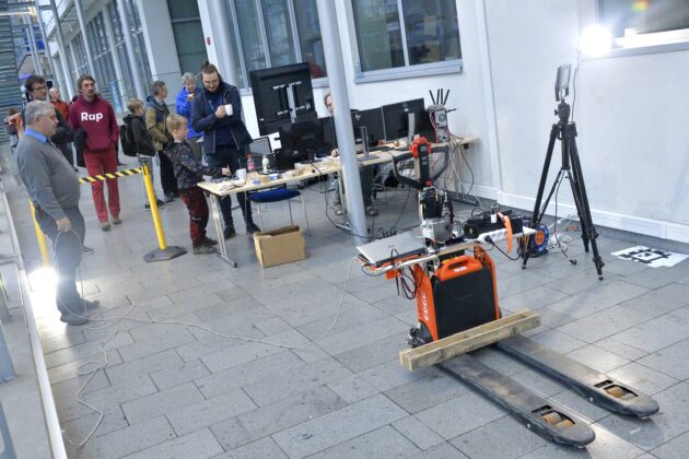 - sledovali vylepšený automatický paletový vozík, který si sám našel náklad, naložil ho a bezpečně dopravil na místo určení – zcela autonomně a bez zásahu člověka;